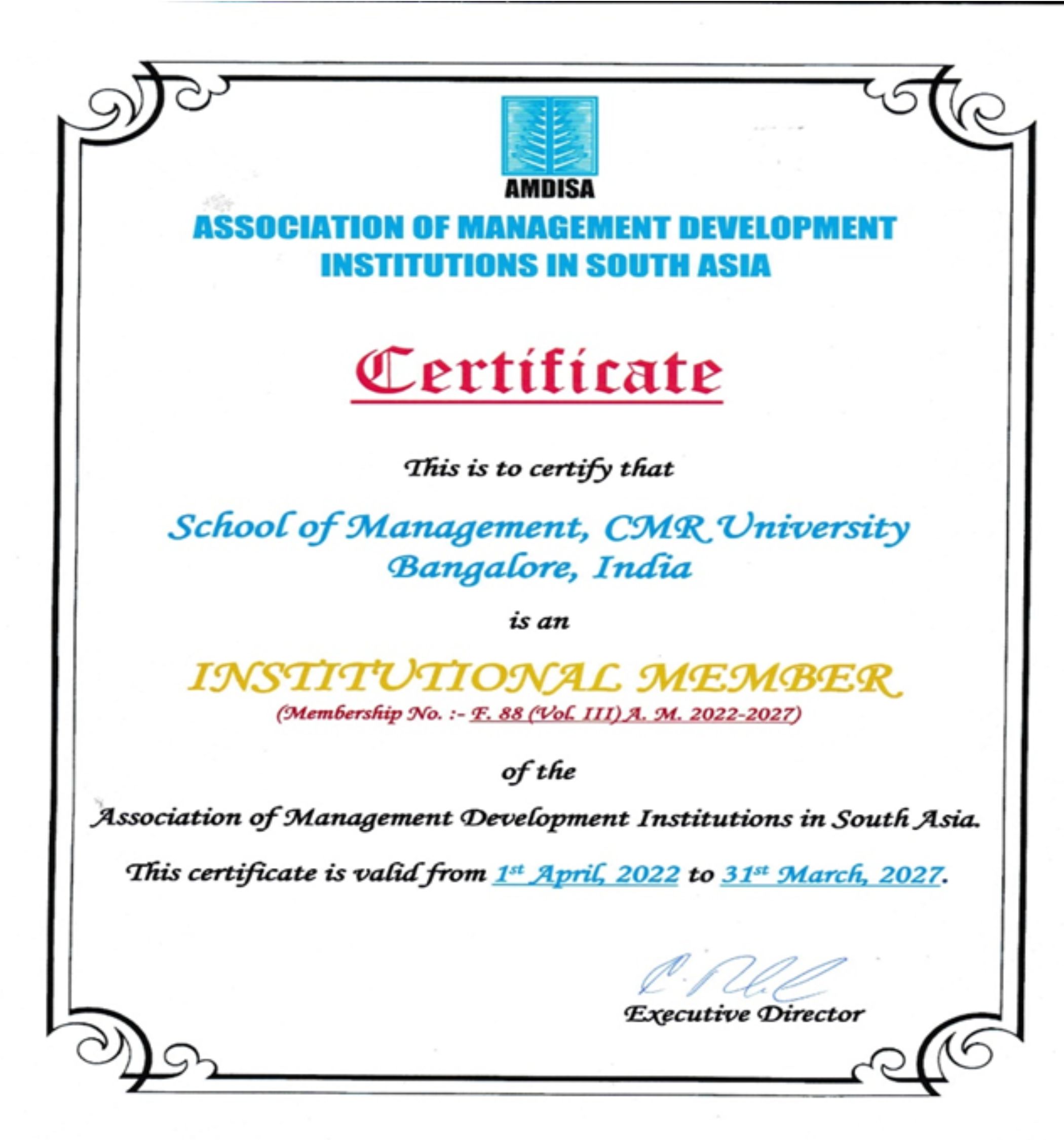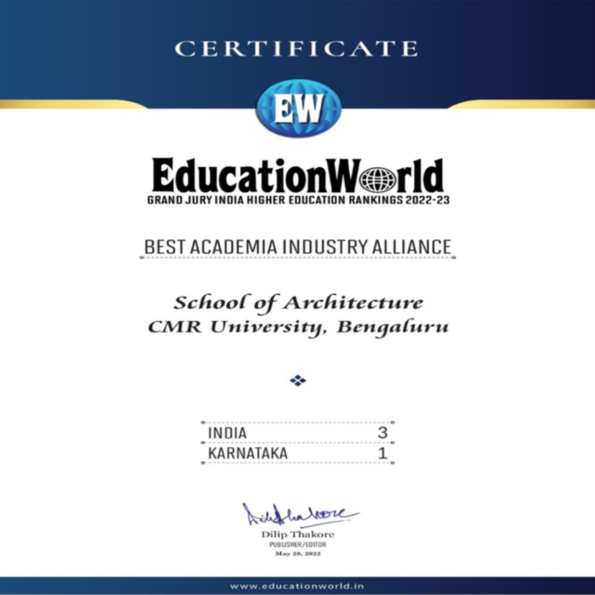 CMR University has been awarded as Best University in South India 2022 and Best University in south India Industry Interface 2022 from Center of Education Growth and Research for the year 2022 , Emerging University of the Year 2022 from Association of Management Development Institute of South India for the year 2022.Certificate Details