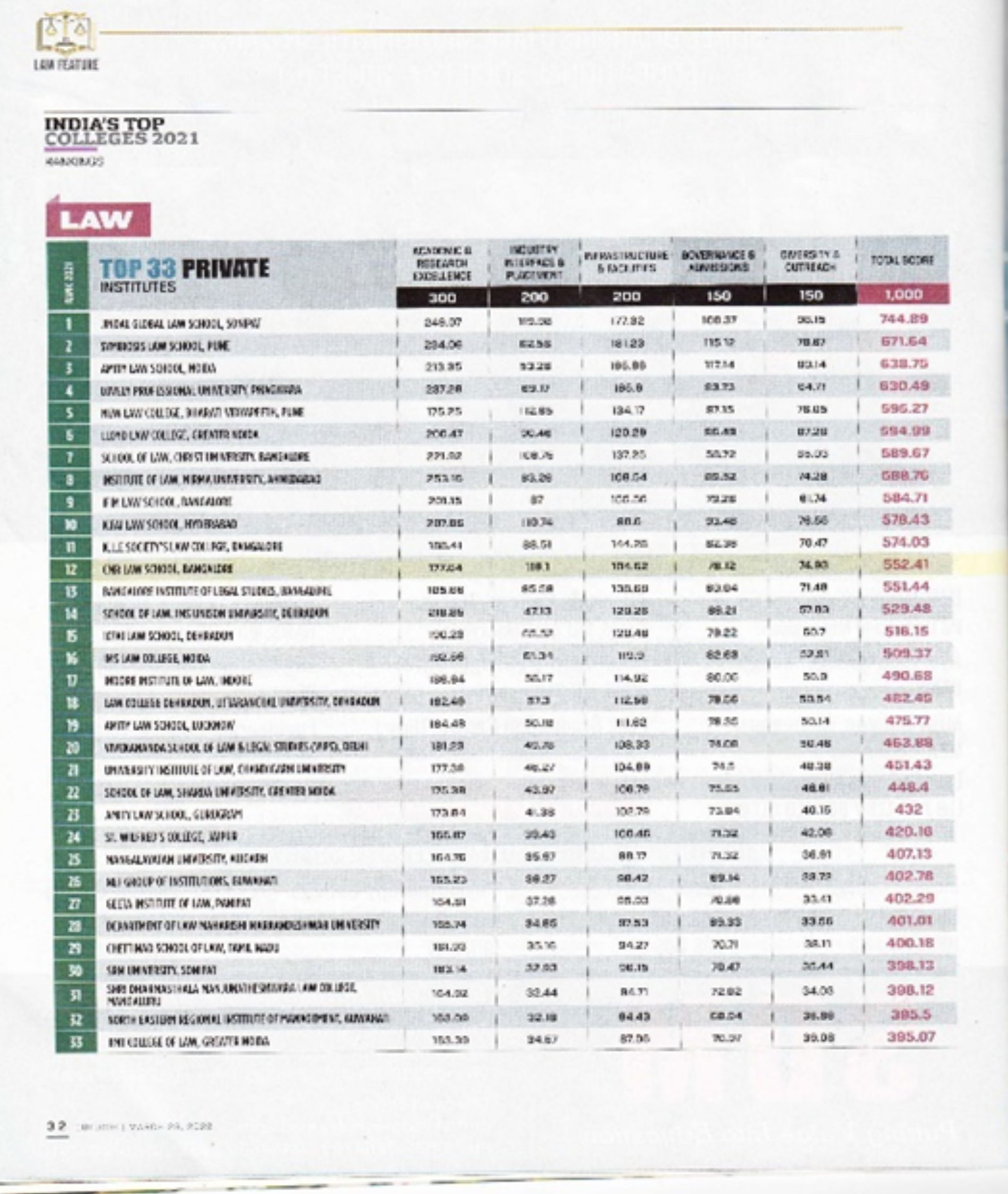 - CMR University School of Legal Studies Bengaluru Ranks 27 All India.
