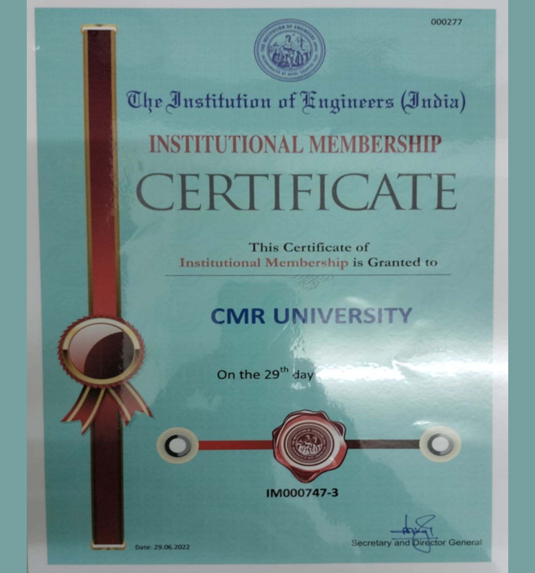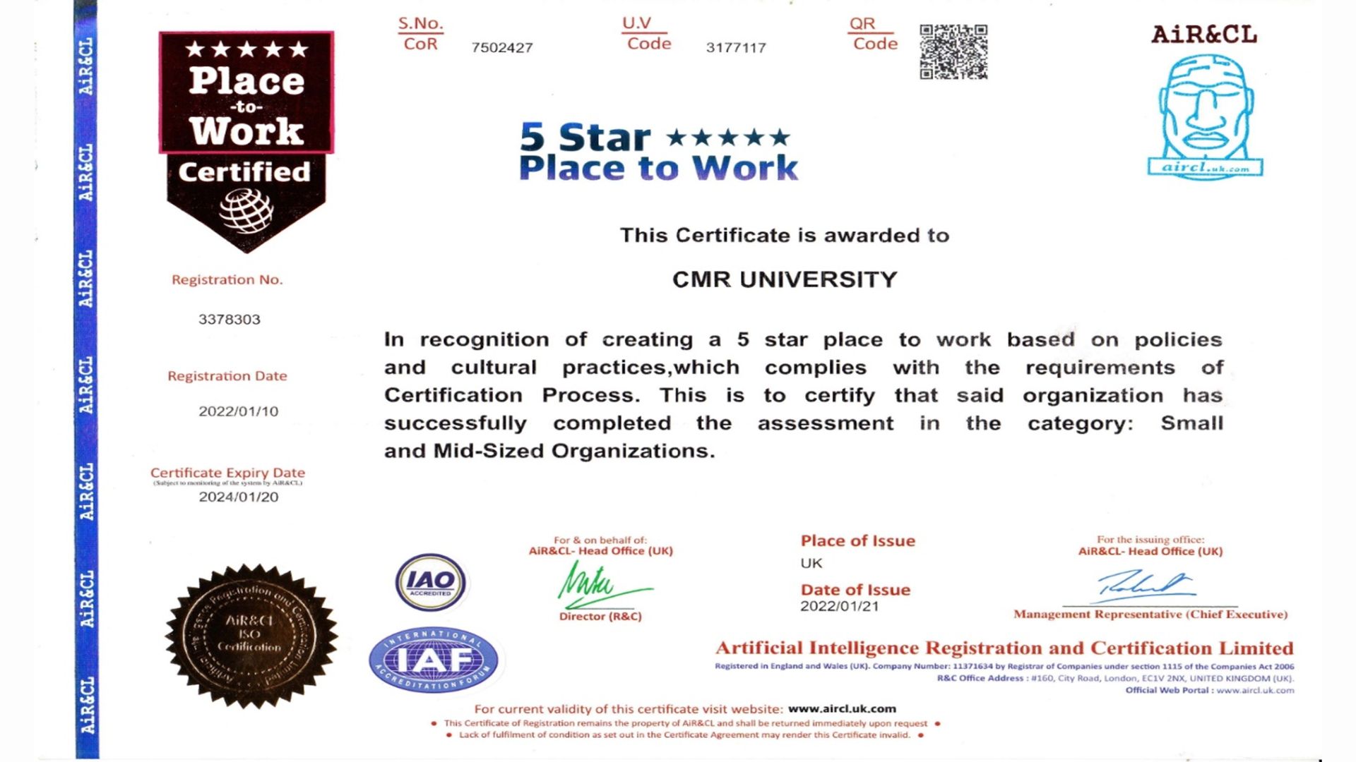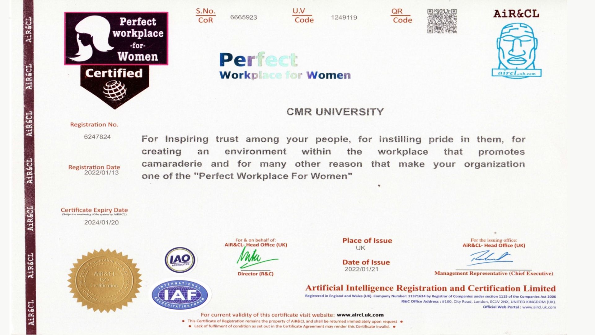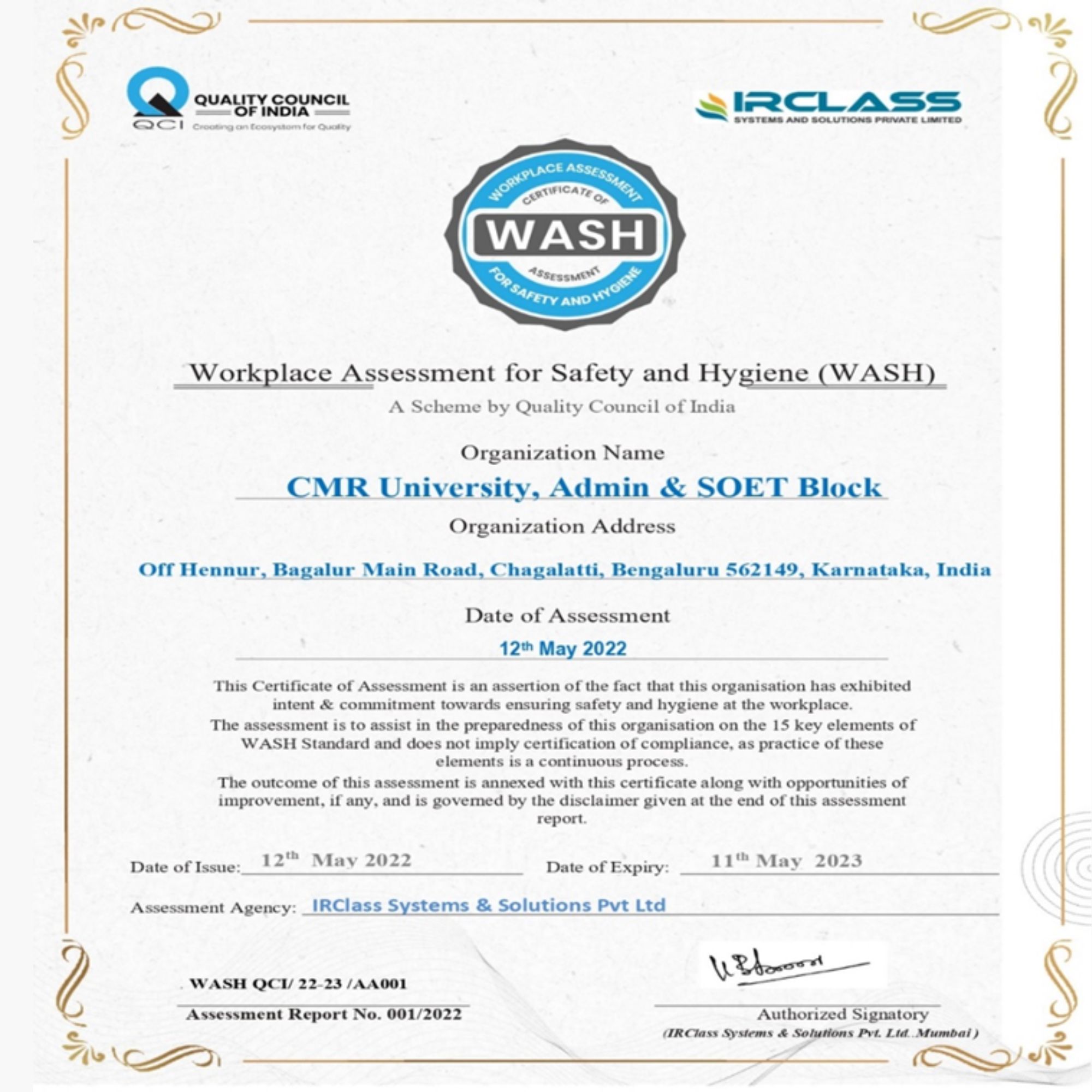 CMR University has received certification for Perfect Work Place for women Certification and Five Star Place to Work Certification from Artificial Intelligence Registration and Certification Limited for the year 2022, ISO Certified 22000-2018 Food Safety Management, ISO 9001-2015 Quality Management System Certification, ISO / IEC 27001: 2013 Information Security Management System Certification, ISO 14001: 2015 Environment Management System Certification from Veritas Assurance International, Kemp House, 160 City Road, London, the United Kingdom for the year 2022, International Accreditation till the Year 2027(Full Accreditation) from International Accreditation Organization, 10685-B, Hazelhurst Dr. # 11524, Huston, TX 77043, USA, for the year 2022, Workplace Assessment for Safety and Hygiene (WASH)- Certification from Quality Council of India, IR Class Systems and Solutions Pvt Ltd for the year 2022.