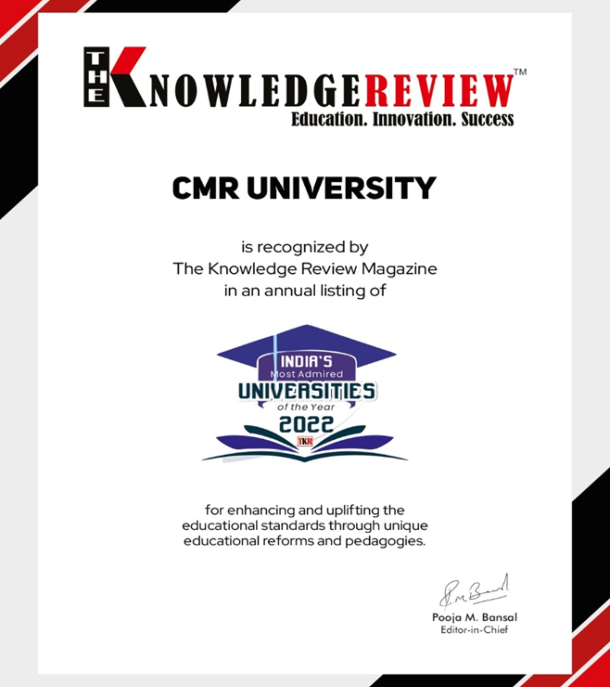 - CMR University has been recognized as The best Universities in India to study, from The Knowledge Review Magazine.
