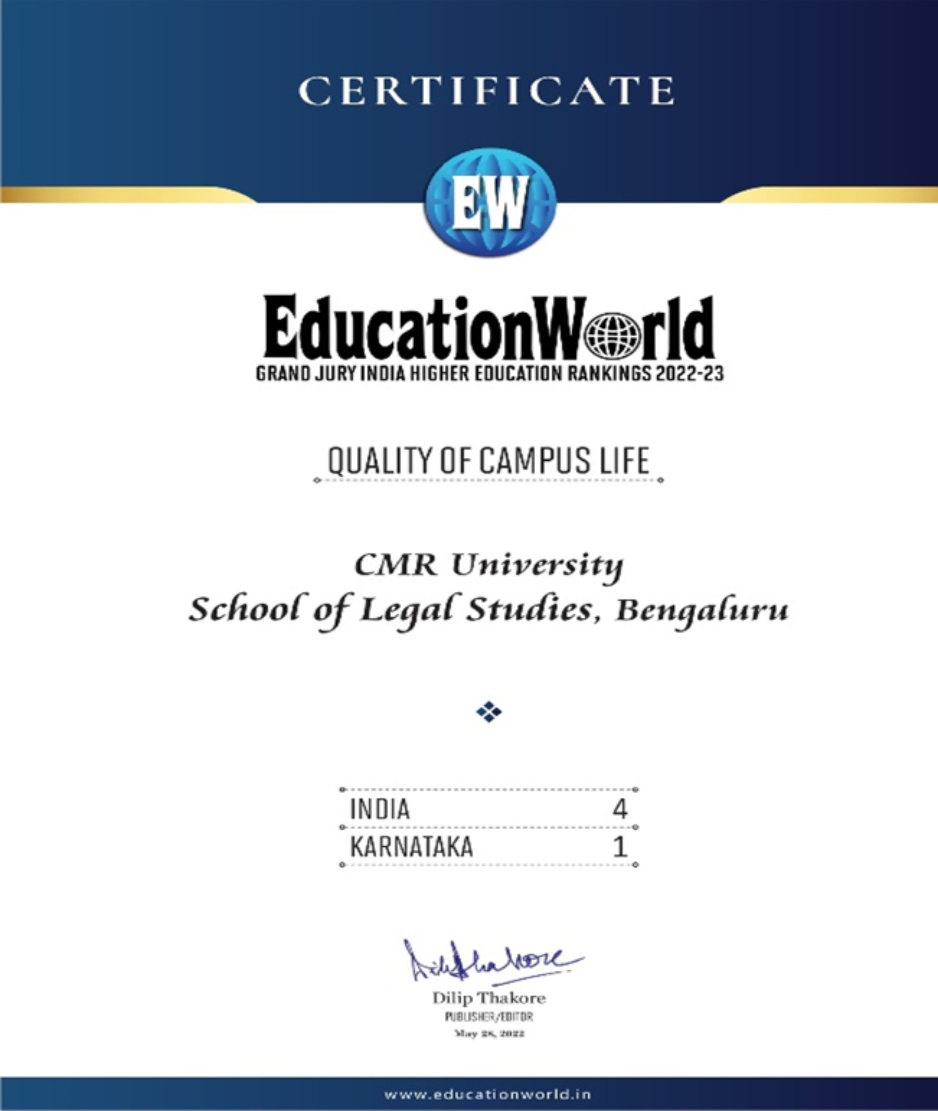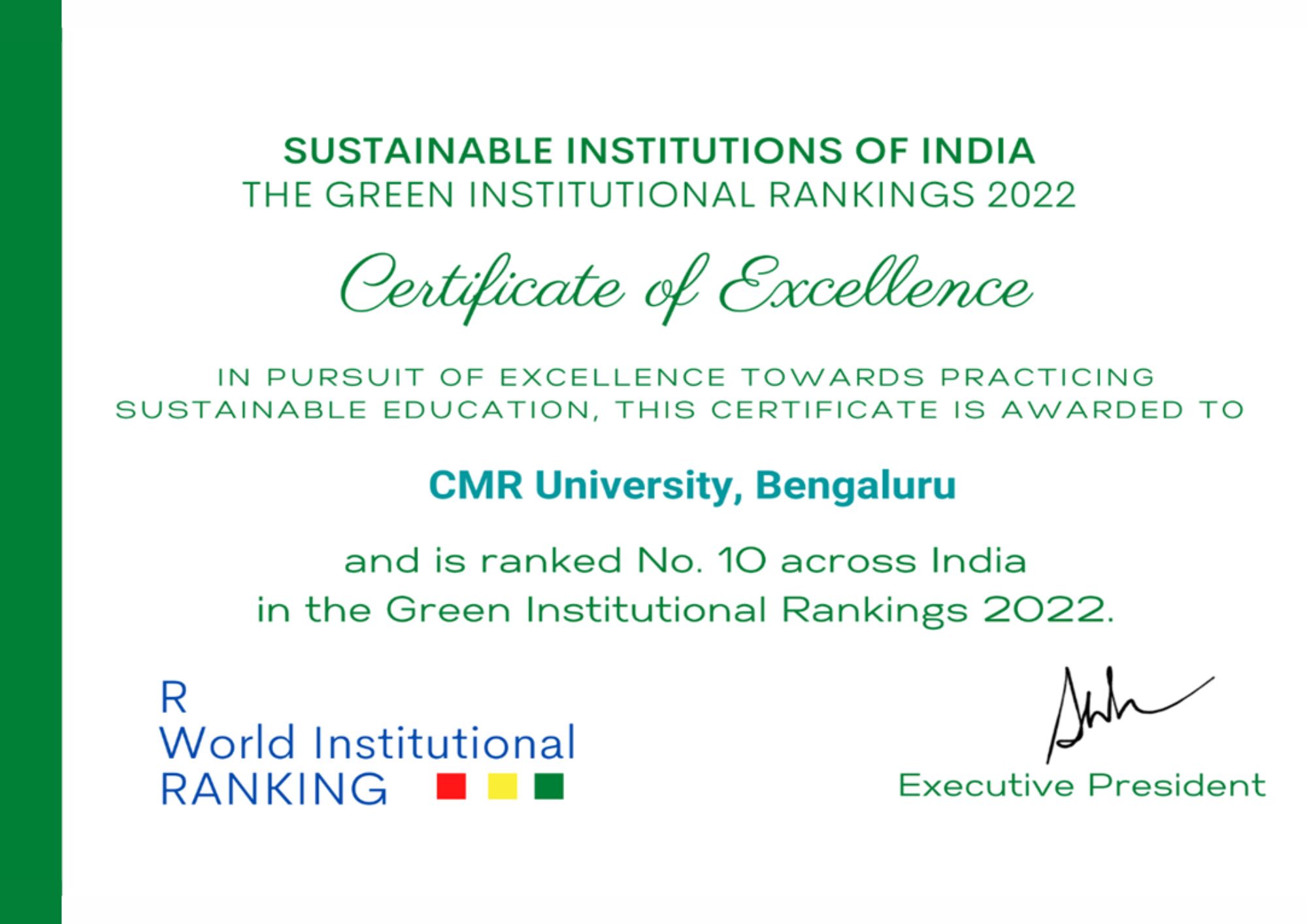 CMR University has been ranked as India’s Top LAW College 2021 from OutLook for the year 2021, The Green Institutional Ranking – 10th Rank- Sustainable Institution of India -2022 , The Global Impact Ranking – 40 th Rank- Institute of Excellence from rom R. World Institutional Ranking, Carnival House, Malad East, Mumbai (IN) for the year 2022, University of Eminence & Best Place to Work- Deemed & Private University Category , State Private University All India Rank- 15 (OVERAll) , State Private University State Rank- 6th , State Private University South Zone Rank- 6th from Indian Institutional Ranking Framework (IIRF), India for the year 2022, All India Level – 40 th RankEW INDIA HIGHER EDUCATION RANKING 2022-23 , All India – State Level – 8 th Rank EW INDIA HIGHER EDUCATION RANKING 2022-23 from Education World, Campus Design Excellence, School of Management , CMR University, Bangalore – All India – National Level – 1st Rank and State Level – 1st Rank, State Level – 1st Rank , Karnataka from Education World, All India – National Level – 3rd Rank , All India – National Level – 4th Rank from Education World, Quality of Campus Life, School of Legal Studies, CMRU, Banaglore, State Level – 1st Rank , Karnataka , MHW Ranking, Best Institue for Campus Life – All India National level Rank 15 from R. World Institutional Ranking, Emerging Engineering Institutes – Placement 2022 – All India level 3rd Rank , Emerging Engineering Institutes- Research Capability – All India level 3rd Rank , Top Emerging Engineering, Institutes in the Country – All India level 4th Rank from Times Engineering, School of Economics and Commerce,CMR University, Bengaluru – All India Rank – 129, School of Legal Studies,CMR University, Bengaluru – All India Rank – 26, School of Management,CMR University, Bengaluru – All India Rank – 171, School of Science Studies, CMR University, Bengaluru – All India Rank – 138 from India – Survey by India Today – Magazine – July-2022, CMR University rated as India’s most admired University of the year 2022 – The Knowledge Review Magazine