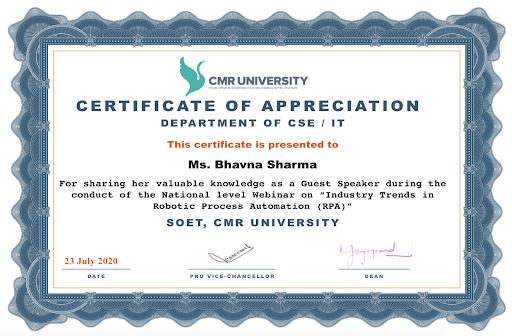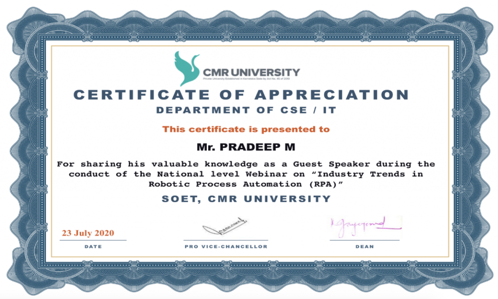 The webinar started with the host Prof. Naveen Ghorpade and Prof. Kiran Mohan welcoming everyone. Our student Ms. Namratha sung prayers and prayed the almighty to shower his gracious blessings upon all of us for the success of the event. Dr. Rubini. P gave a welcome speech. In the absentia welcomed our chief patrons, Chancellor – Dr. Sabitha Ramamurthy, Chairman – Shri. K. C. Ramamurthy, IPS(Retd), Pro-Chancellor – Shri K. R. Jayadeep, Provost – Dr. Trishtha Ramamurthy, Director of Finance- Mrs. Shreya Reddy. Welcomed Pro VC – Dr. Suresh. K. R, Dean – Dr. Jayaprasad. M. Welcomed the speakers Pradeep and Bhavana. Prof. Shruthi Hegde gave an introduction to the speakers’ profile. Pro-VC Dr. Suresh. K.R addressed the participants and spoke encouraging words and wished for the success of the event. Dean of SOET Dr. Jayaprasad. M, addressed the gathering and motivated participants about the importance of the RPA in the current industry market. Speakers Mr. Pradeep. M and Ms. Bhavana Sharma took over the webinar and explained in detail about the topic of the event along with hands-on exposure. Prof. Naveen Ghorpade took feedback from the participants. Prof. Shivaprakash Ranga gave a vote of thanks. Prof. Kiran Mohan concluded the event.